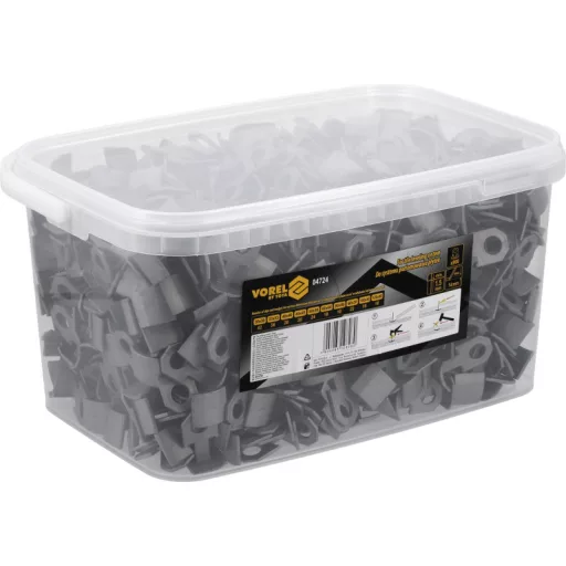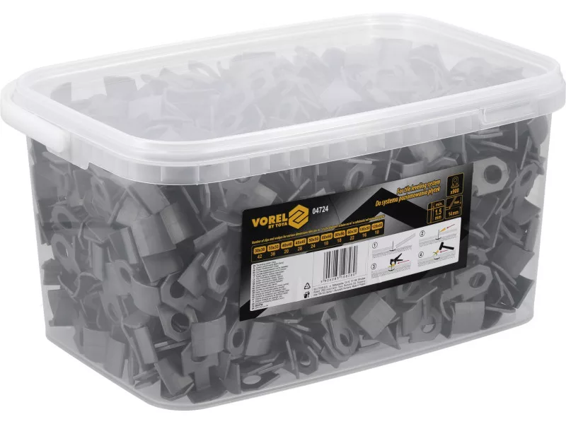 Klipy nivelačného systému, ktorý umožňuje rýchle a jednoduché kladenie dlaždíc. Súprava obsahuje 900 kusov rozoberateľných klipov. Pomáha odstraňovať nerovnosti povrchu. Je určená pre keramické, porcelánové, kameninové, rektifikované podlahové a stenové obkladačky rôznych rozmerov a hrúbok v rozsahu 7-14 mm. Systém nahrádza tradičné krížiky. Zabraňuje posunom počas inštalácie a tuhnutia lepidla a urýchľuje pokládku obkladov a dlažieb s dokonalými škárami a rovinnosťou. Nie sú potrebné žiadne ďalšie nástroje. Môže sa používať na stenách a podlahách a jeho inštalácia je jednoduchá pri akejkoľvek úrovni zručnosti.