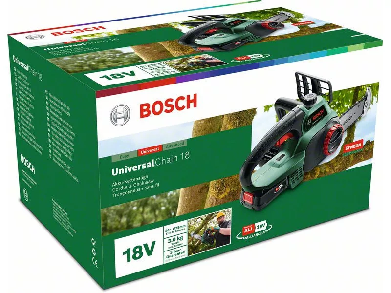 UniversalChain 18 je ľahká, kompaktná a dobre ovládateľná pre efektívne a ovládateľné rezanie - jej hmotnosť s batériou je iba 3 kg. Systém Bosch SDS umožňuje jednoduché nastavenie bez použitia nástrojov. Stabilizujúce držadlo s ochranou čepele zaručuje pevný úchop - čo zabezpečuje lepšiu ovládateľnosť pri podrezávaní a minimalizuje poškodenie vetiev. Jednoduché prepínanie medzi rôznymi úlohami, ako je jemné rezanie, spracovanie odpadu a príprava palivového dreva. Tento nástroj je súčasťou systému POWER FOR ALL ALLIANCE. S jedným akumulátorom môžete prevádzkovať veľké množstvo nástrojov rôznych značiek-