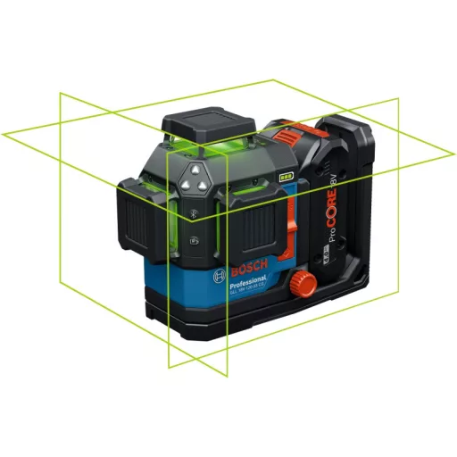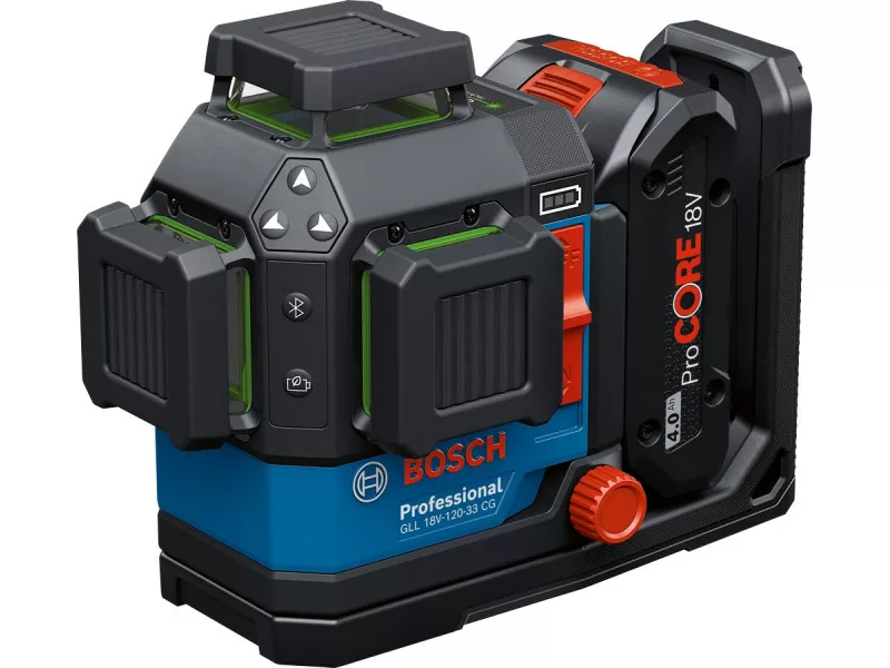 GLL 18V-120-33 CG Professional poskytuje profesionálom v stavebníctve spoľahlivú presnosť aj v najnáročnejších pracovných podmienkach. Princíp troch zdrojov energie umožňuje prepínať medzi platformami s napätím 18V a 12V, rovnako možno použiť aj alkalické batérie typu C na predchádzanie prerušeniam práce, čím sa umožní sústrediť sa na úlohu. Tento robustný líniový laser je vybavený gumeným puzdrom a je chránený v stupni IP65, takže sa nemusíte obávať vody, prachu a nárazov počas práce. Pre jednoduchšiu prácu má laser osvetlenú klávesnicu pre individuálny výber laserových línií, integrovanú podložku s silným magnetom pre rýchle a bezpečné uchytenie. Laserovú líniu možno jemne nastaviť bez straty referenčného bodu vertikálnej línie.