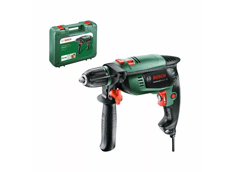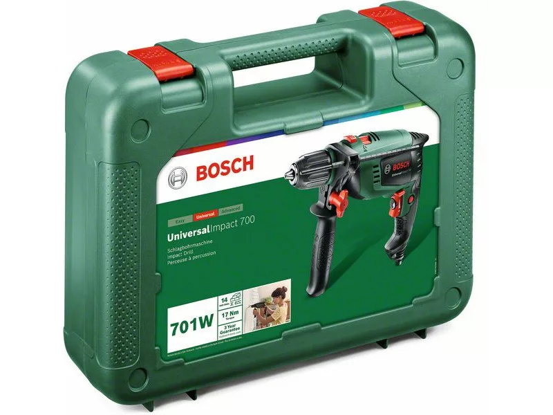 Všestranná UniversalImpact 700 je perfektná vŕtačka s príklepom pre akýkoľvek možný úlohu a projekt, bez ohľadu na materiál. Upínacia skľučovadlo Press&Lock pre rýchlu výmenu bitov na jeden stlačenie tlačidla. Okrem toho, pomocou funkcie Bosch Speed Preselection môžete presne nastaviť rýchlosť vŕtania, takže nástroj pracuje pri správnej rýchlosti pre akýkoľvek materiál. Vďaka ergonomickej konštrukcii je ľahko použiteľný, kompaktný a výrazne ľahký (len 1,7 kg) - pre pohodlnú prácu. Pracuje s hĺbkou vŕtania až do 14 mm v murive a až do 30 mm v dreve.