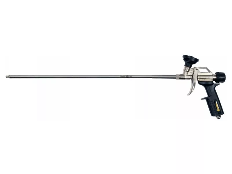 Pištoľ na PU penu s 500 mm dlhou kopijou. Telo odliate z hliníka. Má veľký ľahko ovládateľný gombík na nastavenie prietoku peny.