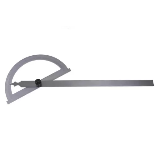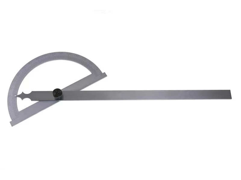 Szögmérő forgókarral, szögalap hossza 300mm, forgatható kar hossza 500mm, 0 - 180°, lehetőség a mért szög rögzítésére az átvitelhez. Rozsdamentes acél, bőr tok.