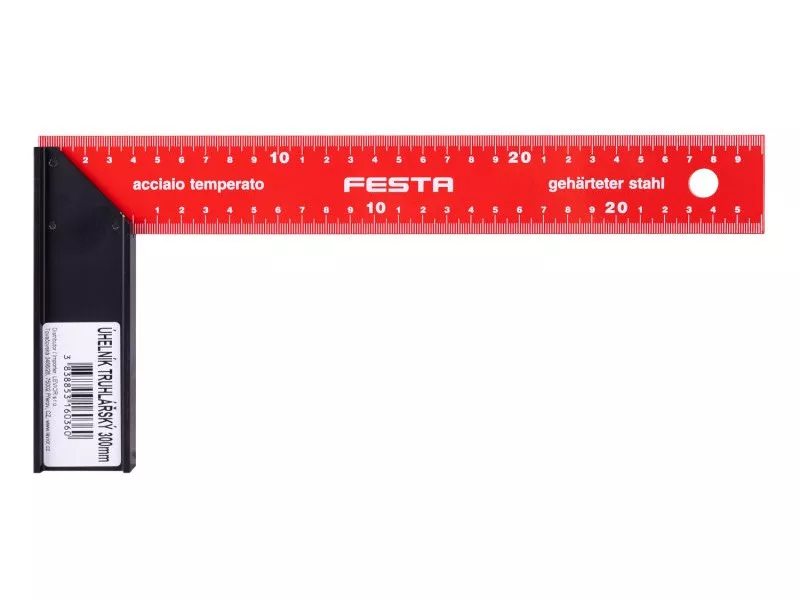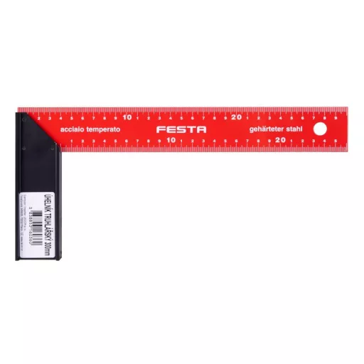 Asztalosszög, minőségi kidolgozás és anyagok (edzett rugóacél, tartókar feketére eloxált alumíniumból), skála mm-ben, pontosság 0,5mm/m.