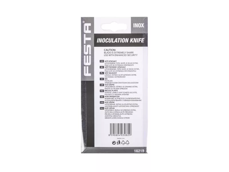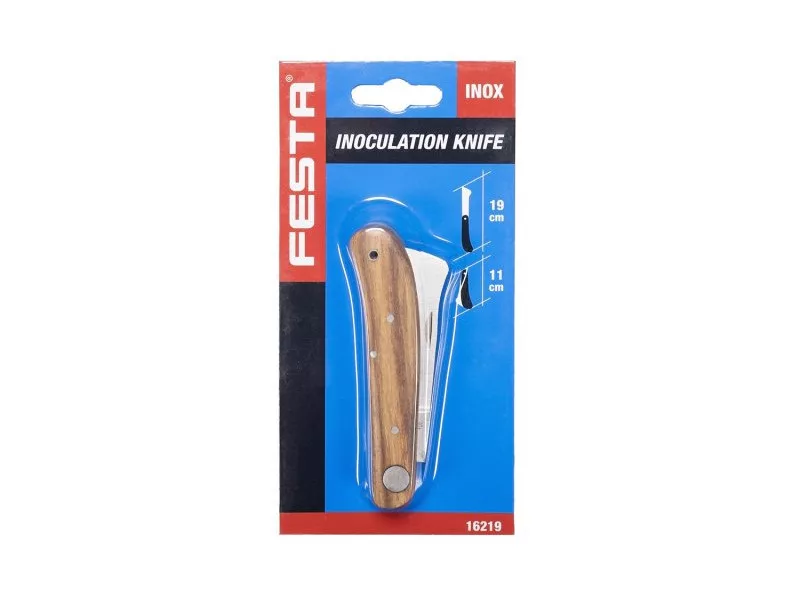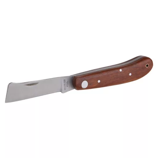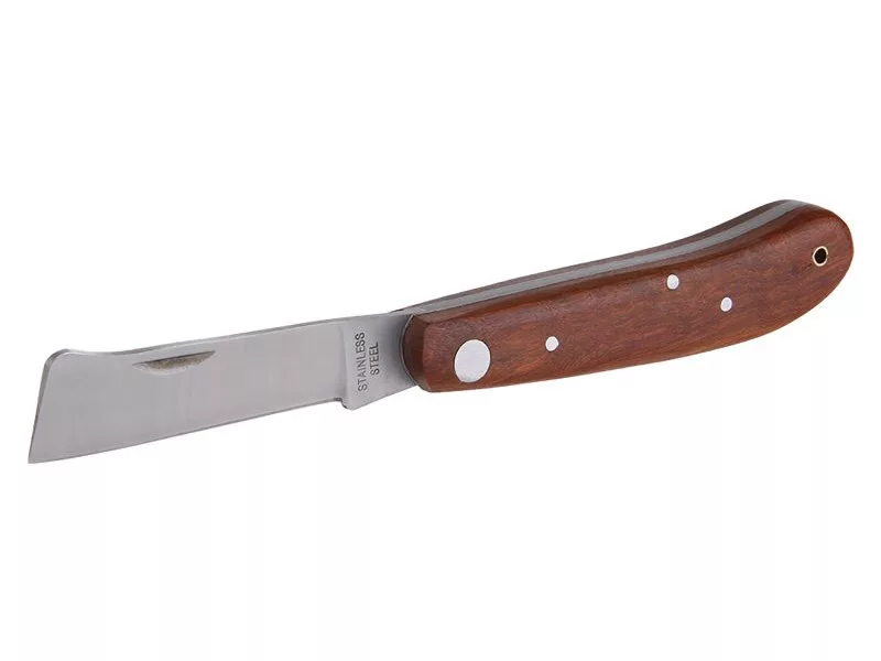 Sklopný nôž na očkovanie, silná nerezová čepeľ, rukoväť z dreva s vysoko kvalitným nitovaním, na očkovanie - na rezanie a ošetrovanie stromov a rastlín, dĺžka čepele 110 mm, blister.