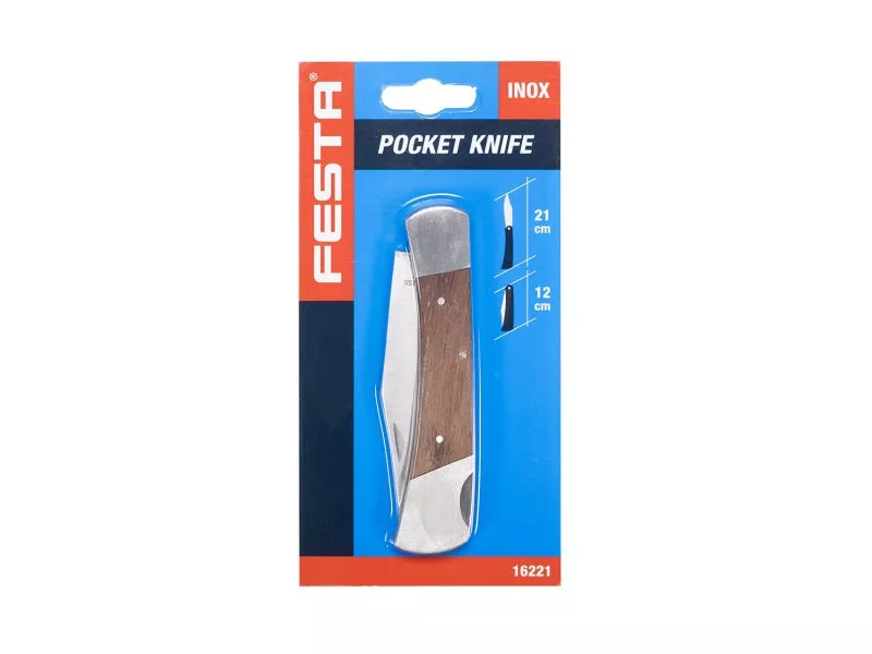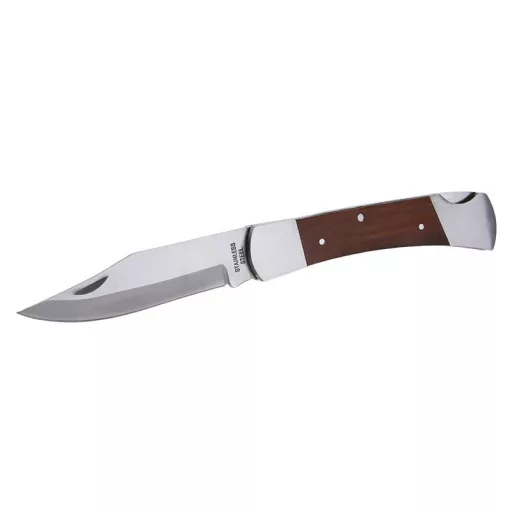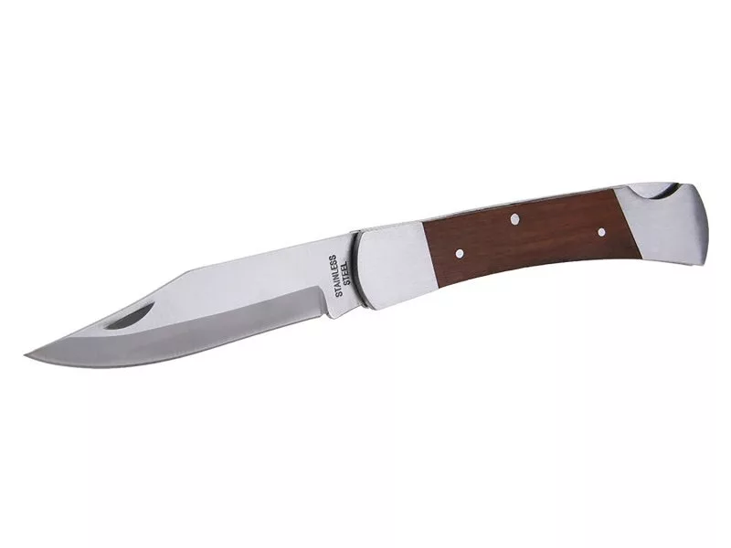 Skladací vreckový nôž so zámkom proti náhodnému zatváraniu čepele, nerezová čepeľ, drevená rukoväť, vynikajúce nitovanie, dĺžka čepele 120 mm, bublinková fólia.