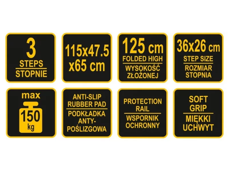 Rebrík má 3 stupne s rozmermi 36x26 cm, ktoré sú navyše vybavené protišmykovými podložkami. Vďaka tomu na ňom môžete stáť s istotou a stabilne bez obáv z pošmyknutia alebo zakopnutia. Dodatočný ochranný držiak v hornej časti rebríka s mäkkou špongiovou výstelkou chráni pred pádom a zároveň sa veľmi pohodlne prenáša.