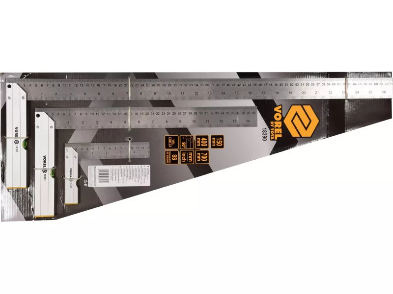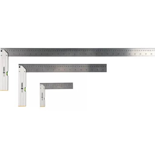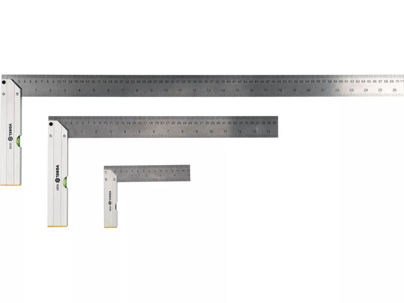 Súprava troch kovových uhlových tyčí s dĺžkami 150 mm, 400 mm a 700 mm určená na vyznačenie pravých uhlov.