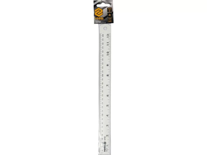 Pevné hliníkové pravítko s celkovou dĺžkou 300 mm s milimetrovým delením do 300 mm na spodnom okraji a palcovým delením do 12" na hornom okraji. Určené na meranie a rysovanie.