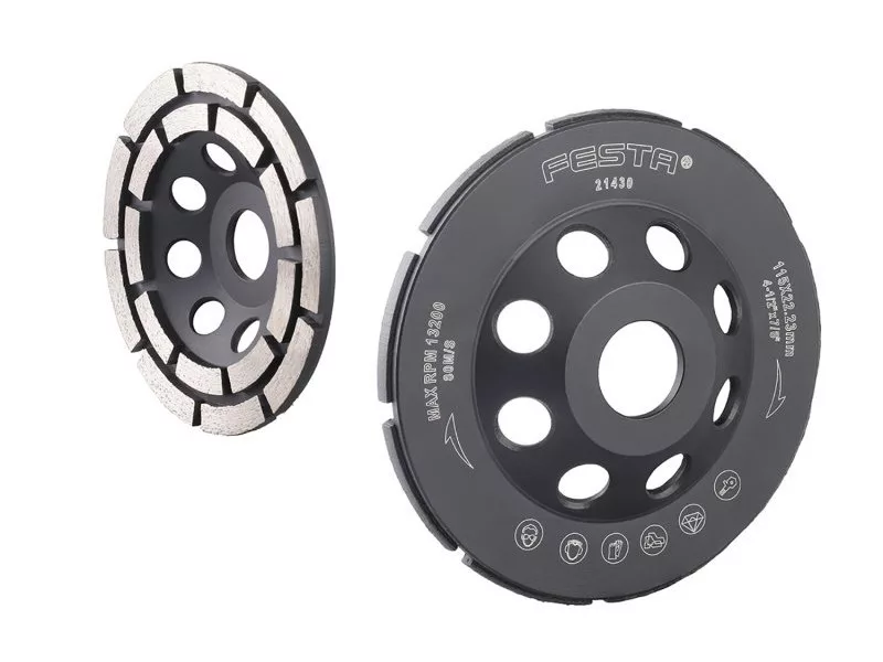 FESTA gyémánt csiszolókorong - kétsoros, robusztus tartólemez tömör ötvözetből készült, speciális kialakítású gyémántszegmensek rögzítése a korong tartótárcsájához, magas gyémántpor tartalom a szegmensekben, felhasználás: száraz és nedves köszörüléshez márvány, gránit, tégla, falazat, természetes és műkő, csempe, burkolat, beton..., a szegmensek formája és kialakítása durva és gyors csiszolásra alkalmas, méretek: a termék megnevezésében feltüntetve, csomagolás: papírdobozban euró lyuk.