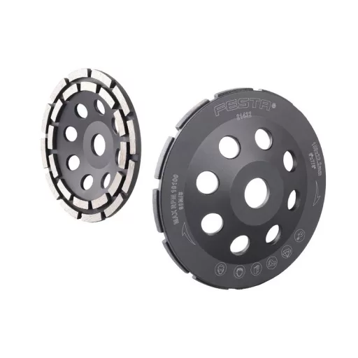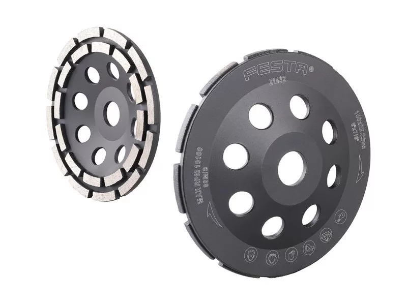 FESTA diamantový brúsny kotúč - dvojriadkový, robustná podložka vyrobená z pevných zliatin, špeciálna konštrukcia na upevnenie diamantových segmentov k podložke kotúča, vysoký obsah diamantového prachu v segmentoch, použitie: pre suché a mokré brúsenie mramoru, granitu, tehál, muriva, prírodného a umelého kameňa, obkladových dosiek, dlaždíc, betónu..., tvar a konštrukcia segmentov sú vhodné pre hrubé a rýchle brúsenie, rozmery: uvedené v názve produktu, balenie: papierová škatuľa s európskym otvorom.