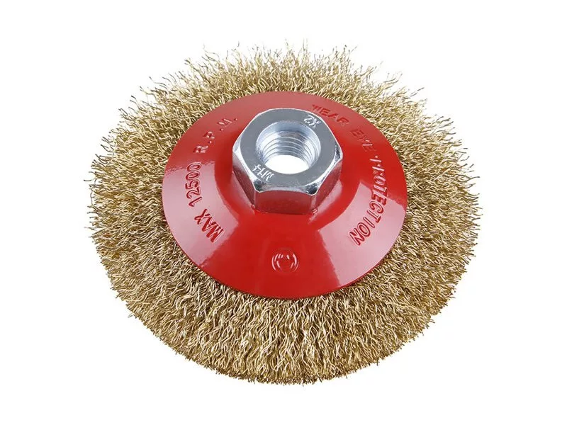 Forgókefe - csésze, FESTA kefe garantálja a minőségi felhasznált anyagokat és feldolgozást, hullámos huzal - sárgaréz bevonatú 0,3 mm, átmérő 100 mm, M14 rögzítés, huzalok száma 1800, maximális fordulatszám percenként. 12500, felhasználás: rozsda eltávolítására, festékre, polírozásra.