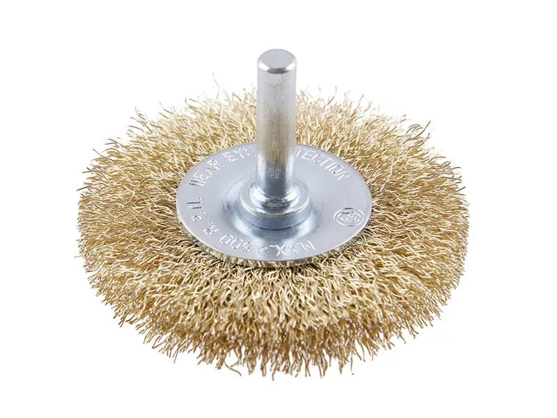 Forgókefe - kör alakú, kivitel: hullámos huzal 0,25 mm - sárgaréz, átmérő 60 mm, szár 6 x 27 mm, horganyzott kefetest, huzalok száma: 1080, huzalhossz: 15 mm, megengedett fordulatszám: 4500 1/. min, felhasználás: polírozáshoz, érdesítéshez, rozsda és sorja eltávolításához, csomagolás: eurolyukkal ellátott buborékfólia.