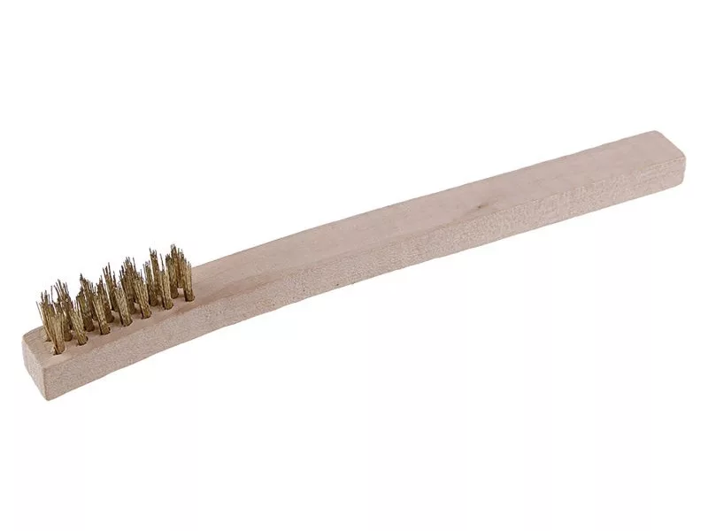 Acélkefe - kézi, acéldrót - sárgaréz bevonatú, fa test, kis kivitel, 3 soros, felhasználás: vasfémek, pl. acél, rozsdamentes acél, öntöttvas tisztítására, érdesítésre, régi bevonatok durva eltávolítására nehezen kivehető helyeket elérni.