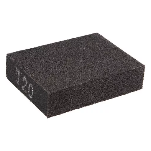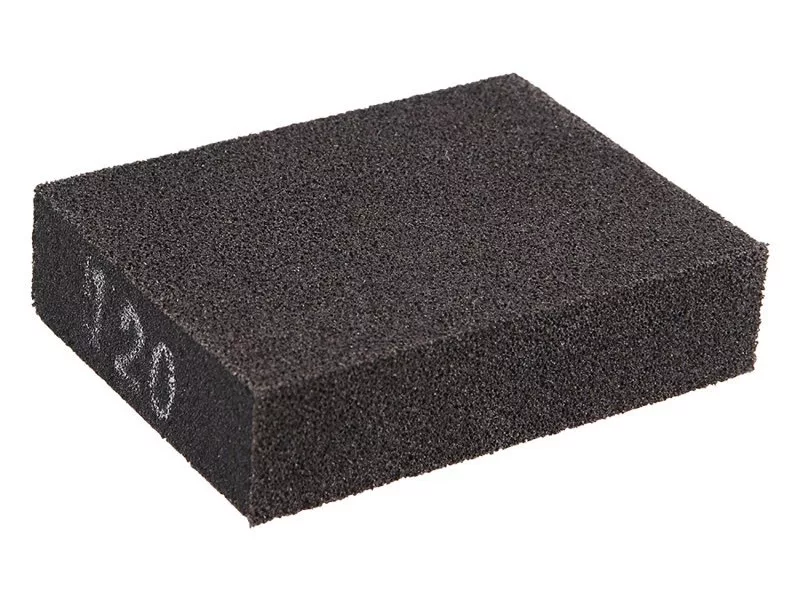 Brúsivý špongia, základňa: extrémne pružná pena, zrnitosť: 120, typ zrnitosti: karbid kremíka, väzivo: živica, použitie: medzifázové brúsenie lakov, farieb, plniv a starých lakov, brúsenie dreva, kovu, plastu, brúsenie povlakov v záhyboch a na povrchu, brúsenie sadrokartónu,..., rozmery: sú uvedené v názve výrobku, balenie: papierový obal s euro otvorom.