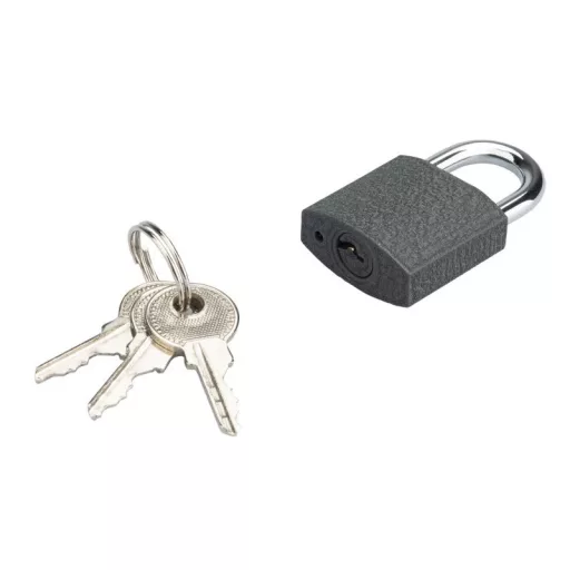 25 mm oceľový kalený zámkový teliesko, kalený oceľový oblúk pre lepšiu odolnosť voči rezu. Hmotnosť: 47g Kľúče: 3.