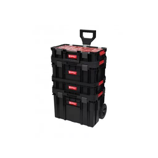 Mobilný vozík, nástrojový box a organizér pre malé diely alebo príslušenstvo, spojené tromi páry ľahko použiteľných bočných konektorov.