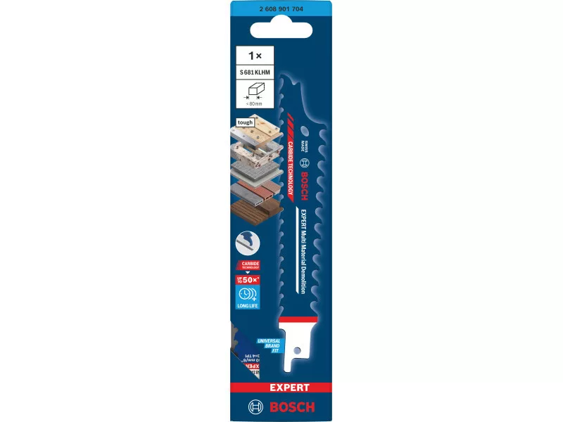 Az EXPERT Multi Material Demolition szablyafűrészlap ultra kemény, megerősített keményfém fogakkal rendelkezik, amelyeket szilárdságra, tartósságra és nagy sebességű vágásra terveztek. Innovatív, karom alakú első foga segít gyorsan beleharapni az anyagba. A fűrészlap tetején található agresszív 3-TPI keményfém fogaknak köszönhetően könnyedén vághatsz visszafelé is, anélkül, hogy meg kellene fordítanod a szerszámgépet. A nagy hornyok hatékonyan eltávolítják a forgácsokat, így a legkeményebb anyagokat is gyorsabban lehet vágni, mint valaha.