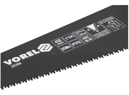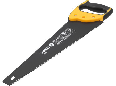 Klasszikus, kézi fűrész fa vágásához, úgynevezett Fizetés. Fűrész hossza 450mm. A pengét mangánacélból készítették, 65 MN jelzéssel, állandóan bevonva PTFE / Teflon / réteggel, amely csökkenti a súrlódást és felgyorsítja a vágást. A három síkon élezett fog garantálja az agresszív vágást mindkét irányban. Ergonomikus nyél, ABS és TPR műanyagból. A munkarész keménysége 50 - 54 HRC. Oszlop 7 TPI. Fa vágó fűrész és fa alapú anyagokhoz, valamint néhány műanyaghoz. PTFE / Teflon / réteg gyorsítja a vágást.
