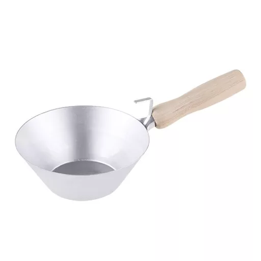 160 mm-es falazókanál fa nyéllel és akasztóval. Ez egy kőműves szerszám, amelyet építőanyagok mozgatására használnak: habarcs, beton stb.