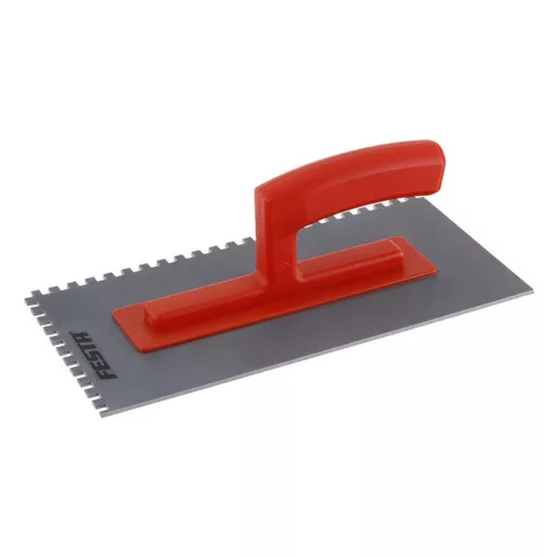 Prevodový hladkovač z odolného ABS plastu 280 x 140 mm, e6 zub, s plastovou rukoväťou o hrúbke 3 mm. Používa sa hlavne na nanášanie lepidla pod dlaždice a obklady, ako aj na nanášanie estrikhov, štukov, omietok, tesniacich materiálov a iných stavebných materiálov.