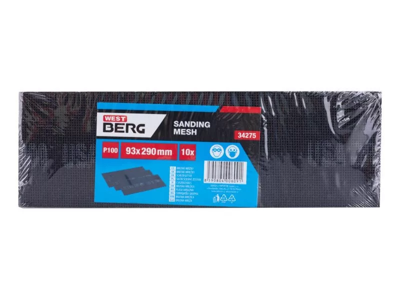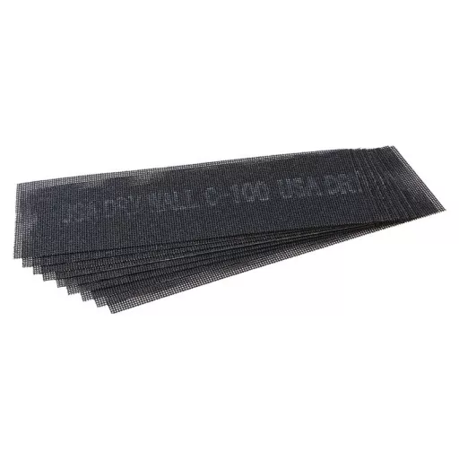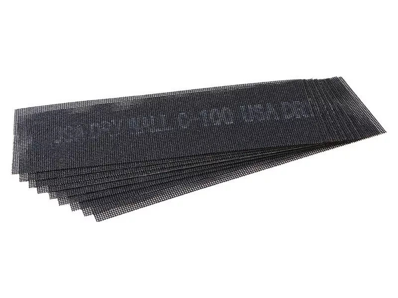 Csiszolőrács 93 x 290 mm, szemcse 100, 10 db/készlet. , üvegszálból készült tartószövet, szilícium-karbid gyantával ragasztott csiszolószemcsék antisztatikus bevonattal, alkalmas gipszkarton hézagoló keverékek és egyéb anyagok csiszolására, a rácsszerkezet előnye a hagyományos csiszolópapírokhoz képest, hogy nem tömődik el a csiszolt anyaggal .