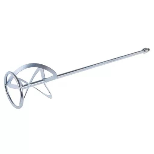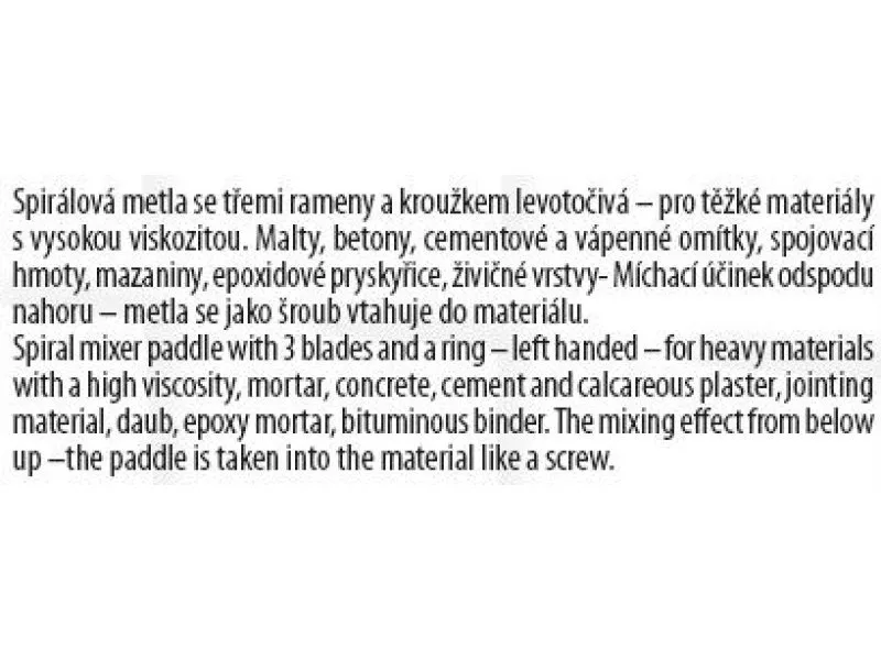 Miešačka - smerom hodinových ručičiek (miešanie odspodu hore) - šľahač, galvanizovaný, rozmer: M14 120 x 600 mm - M14, použitie: pre ťažké materiály s veľkou viskozitou, maltu, betón, cementové a vápenné omietky, lepidlá, estrichy, epoxidové živice, bitúmenové vrstvy.