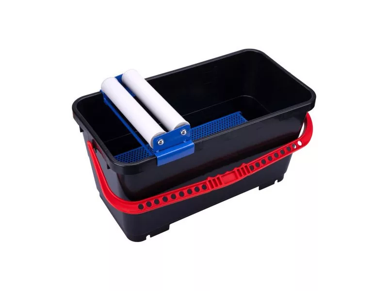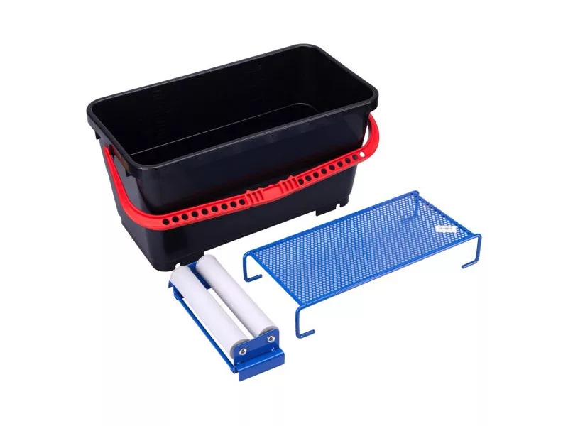 Mosókád - készlet, összetétel: 24 l-es tartály (90070), görgők (90071), fémrács (90072), könnyű és rendkívül ellenálló műanyag edény, műanyag bevonatú fémhengerek és comaxitizált rács, felhasználás: simítók és szivacsok mosására mosáskor a párosítás után megkímélő keverék, a görgők a víz kipréselésére szolgálnak a simítóból, a rács megakadályozza a szennyeződés kijutását a tartály aljáról.
