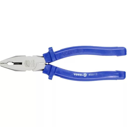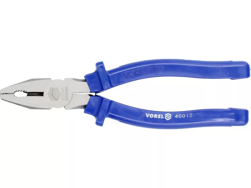 Univerzálne kliešte s dĺžkou 200 mm od spoločnosti Vorel. Čepele vhodné na strihanie drôtu, klincov. Povrch čeľustí je vrúbkovaný, čo umožňuje bezpečné uchopenie plochých predmetov a menších nástrojov. Rukoväte pokryté pohodlnými plastovými krytkami.