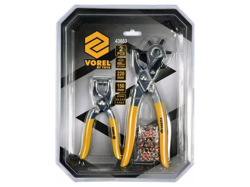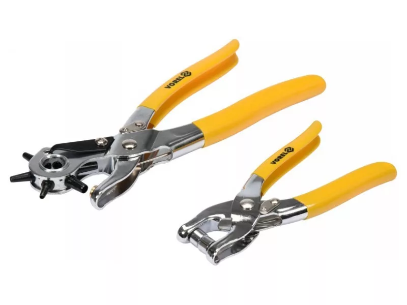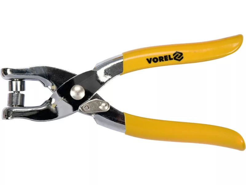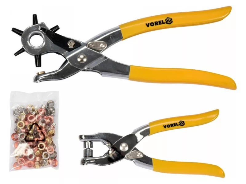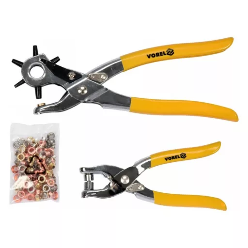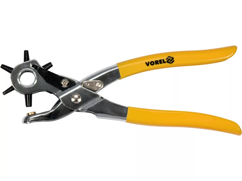 Súprava dierovačov z uhlíkovej ocele značky Vorel na vytváranie otvorov do kože, sieťoviny, gumy, kartónu a iných materiálov.