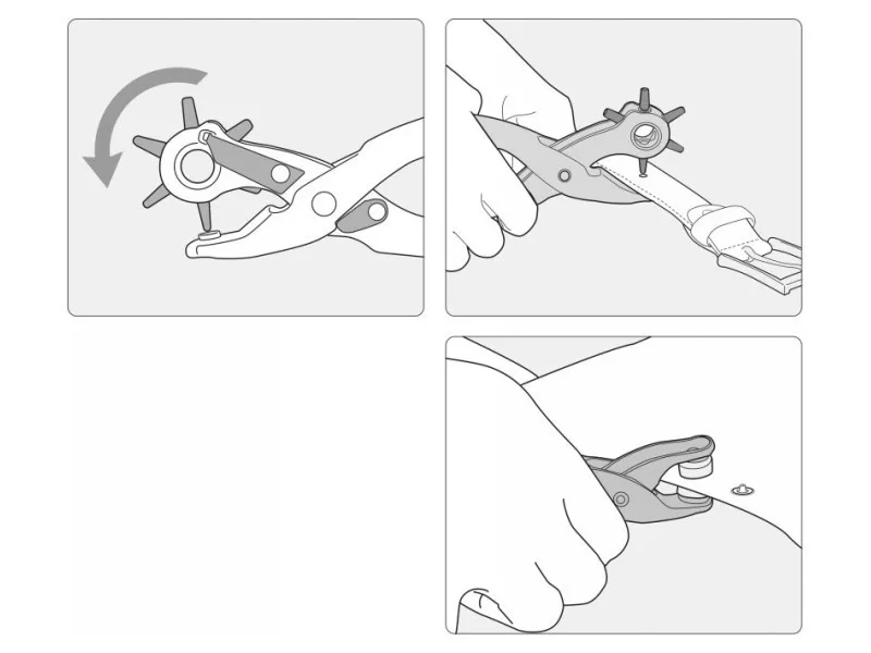 Pomocou dierovača môžeme vyrezať otvory s priemerom 2,5, 3, 3,5, 4, 4,5, 5 mm. Tvrdené hroty dierovača. Je vybavený západkovým mechanizmom na zaistenie správneho priemeru.