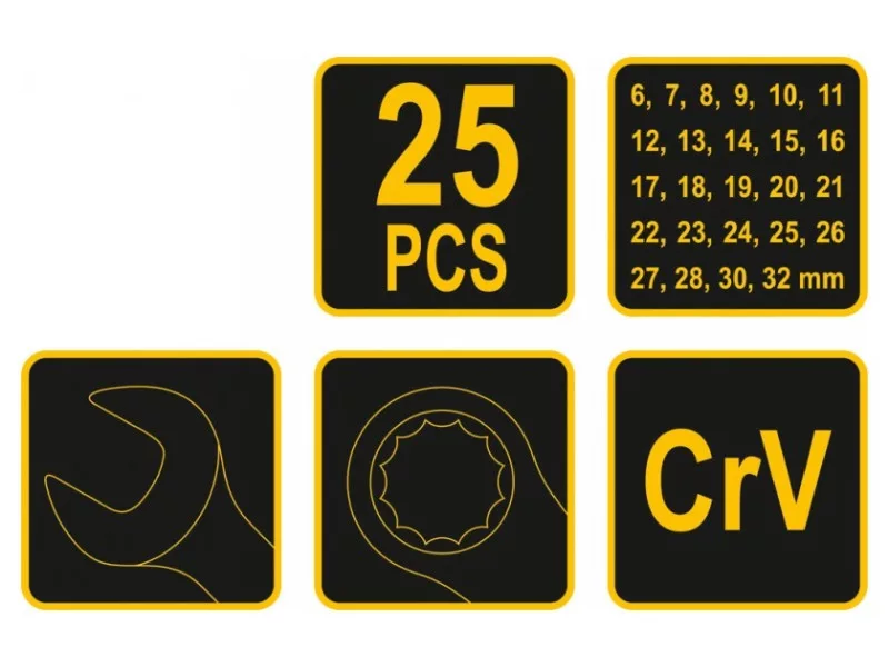 • Kľúče: 6, 7, 8, 9, 10, 11, 12, 13, 14, 15, 16, 17, 18, 19, 20, 21, 22, 23, 24, 25, 26, 27, 28, 30, 32 mm