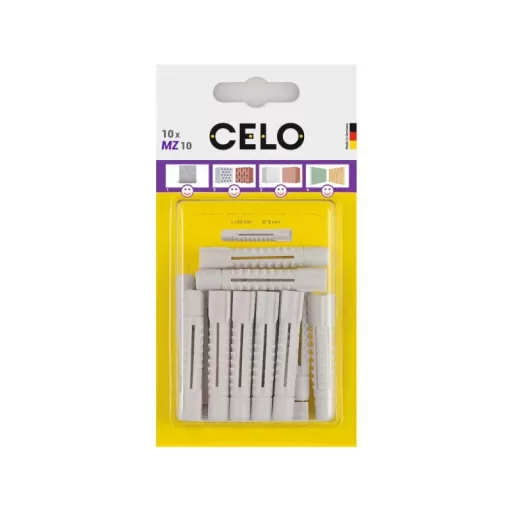 Univerzálny hmoždinka CELO MZ si už mnohokrát dokázal svoju vynikajúcu kvalitu a je použiteľný takmer vo všetkých stavebných materiáloch. Štvorsmerné rozšírenie hmoždinky v pevných materiáloch a uzlujúci efekt v dutých stavebných materiáloch a sadrokartóne vždy zabezpečuje spoľahlivé uchytenie s vysokou nosnosťou. Je kompatibilný s rôznymi typmi a veľkosťami skrutiek. Obsahuje kvalitný polyetylén, ktorý zaručuje trvalú pružnosť univerzálnej hmoždinky MZ.