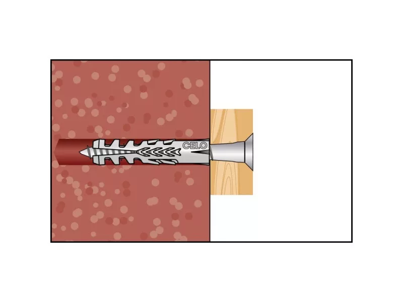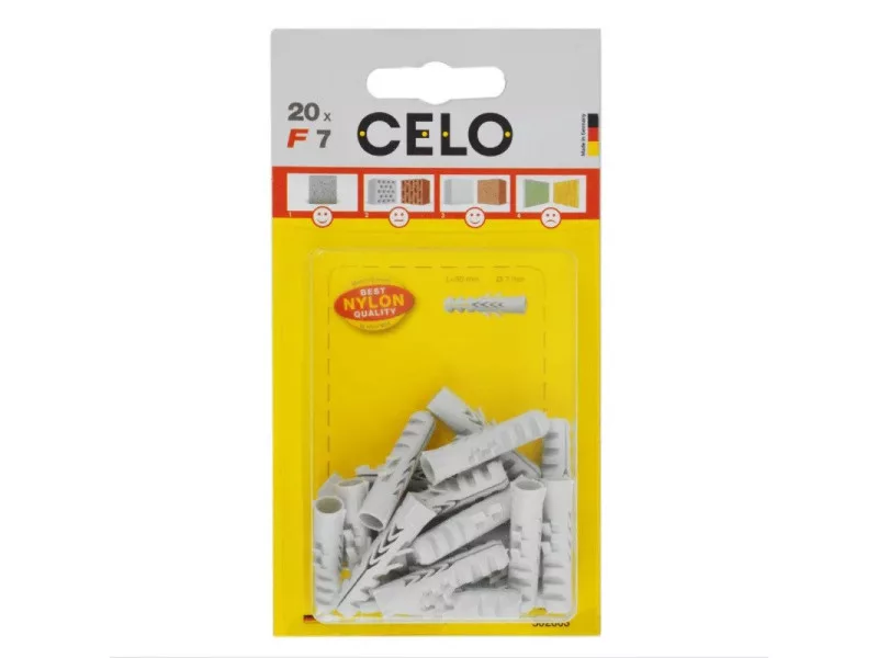 Univerzálny hmoždinka CELO F vďaka veľkej schopnosti rozpínania disponuje vysokými hodnotami odolnosti voči vyťahovaniu. Je dostupný v širokom rozmedzí veľkostí s priemerom 4-20 mm. Univerzálny hmoždinka F je ideálnou voľbou pre pevné stavebné materiály, ale aj pre duté tehly a pórobetónové konštrukcie, kde ponúka dobrú zaťažiteľnosť. Vďaka dobrej vedeniu skrutky, skrutka sa pri zasúvaní nepohybuje.