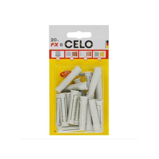 Obľúbené hmoždinky CELO FX s rozpínaním vo štyroch smeroch zabezpečujú veľmi vysokú zaťažiteľnosť v rôznych stavebných materiáloch. Rebrá zabraňujú otáčaniu sa v otvore. Vďaka golieru na hlave neklzá do otvoru. Hmoždinky FX sú vyrobené z kvalitnej, odolnej voči starnutiu nylonu. Môžu sa používať s rôznymi typmi skrutiek, ako sú drevené, drevotrieskové, seberezacie skrutky atď. Sú odolné voči teplotám od -40 °C do +80 °C. Hmoždinky FX umožňujú široké použitie.