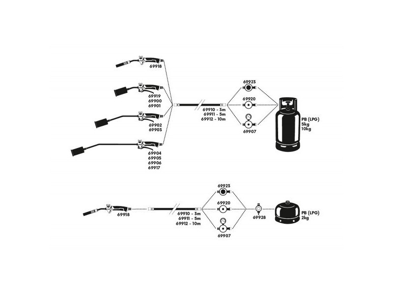 Hadica má na oboch koncoch závit G 3/8", môže sa používať iba s tlakovým regulátorom - pozrite si schému zapojenia na obrázku.