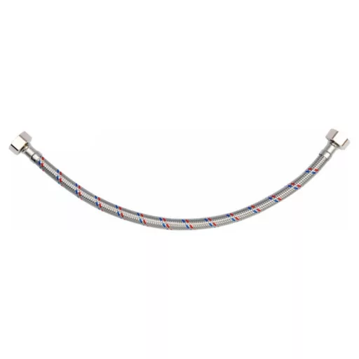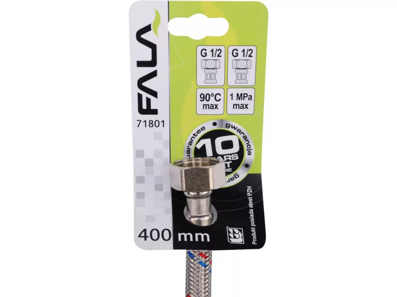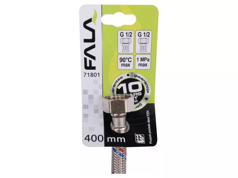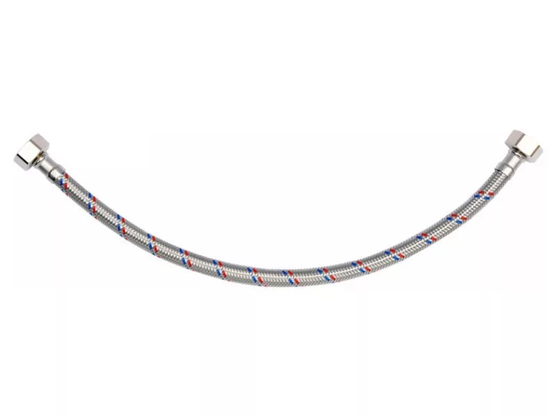 Flexibilná pripojovacia hadica s opletením z nehrdzavejúcej ocele. Vhodná na teplú a studenú vodu. Schválená Štátnym hygienickým ústavom na styk s pitnou vodou. Dĺžka 400 mm. Maximálny tlak 1 MPa. Maximálna teplota 90 C. Priemerný prietok 32 l/min. Vnútorný priemer 8 mm a vonkajší priemer 12 mm. Pripojovacie závity: vnútorný 1/2" x vnútorný 1/2". Gumová hadica EPDM, poniklované mosadzné prípojky, gumové tesnenie EPDM. Je určená na pripojenie WC splachovačov alebo ventilov.
