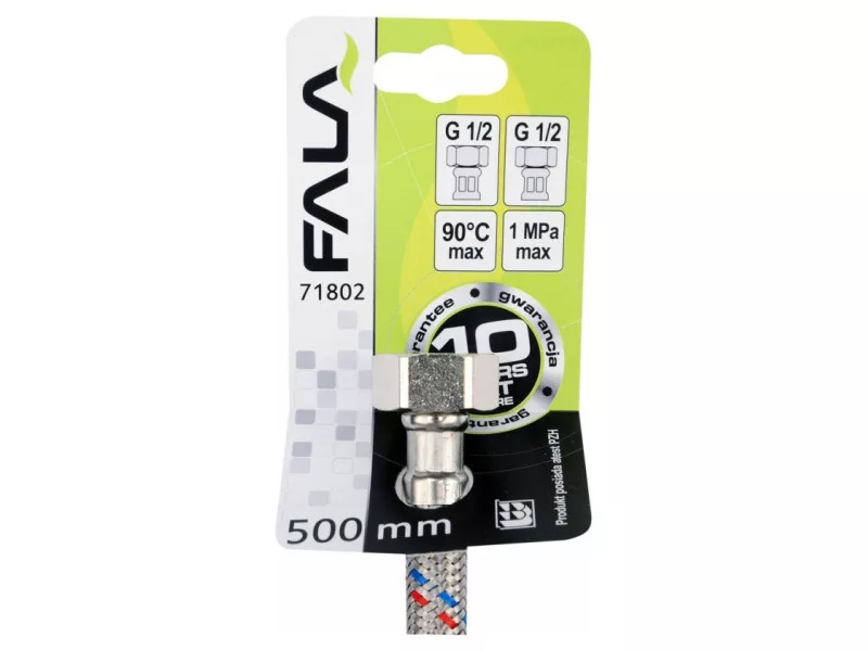 Flexibilná pripojovacia hadica s opletením z nehrdzavejúcej ocele. Vhodná na teplú a studenú vodu. Schválená Štátnym hygienickým ústavom na styk s pitnou vodou. Dĺžka 500 mm. Maximálny tlak 1 MPa. Maximálna teplota 90 C. Priemerný prietok 32 l/min. Vnútorný priemer 8 mm a vonkajší priemer 12 mm. Pripojovacie závity: vnútorný 1/2" x vnútorný 1/2". Gumová hadica EPDM, poniklované mosadzné prípojky, gumové tesnenie EPDM. Je určená na pripojenie WC splachovačov alebo ventilov.