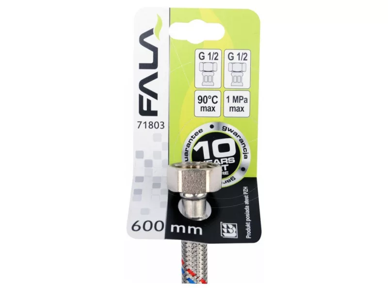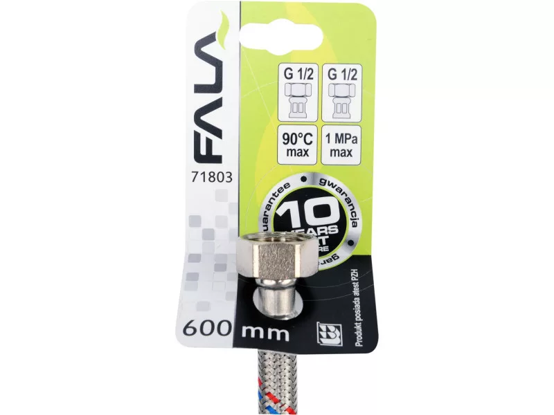 Flexibilná pripojovacia hadica s opletením z nehrdzavejúcej ocele. Vhodná na teplú a studenú vodu. Schválená Štátnym hygienickým ústavom na styk s pitnou vodou. Dĺžka 600 mm. Maximálny tlak 1 MPa. Maximálna teplota 90 C. Priemerný prietok 32 l/min. Vnútorný priemer 8 mm a vonkajší priemer 12 mm. Pripojovacie závity: vnútorný 1/2" x vnútorný 1/2". Gumová hadica EPDM, poniklované mosadzné prípojky, gumové tesnenie EPDM. Je určená na pripojenie WC splachovačov alebo ventilov.