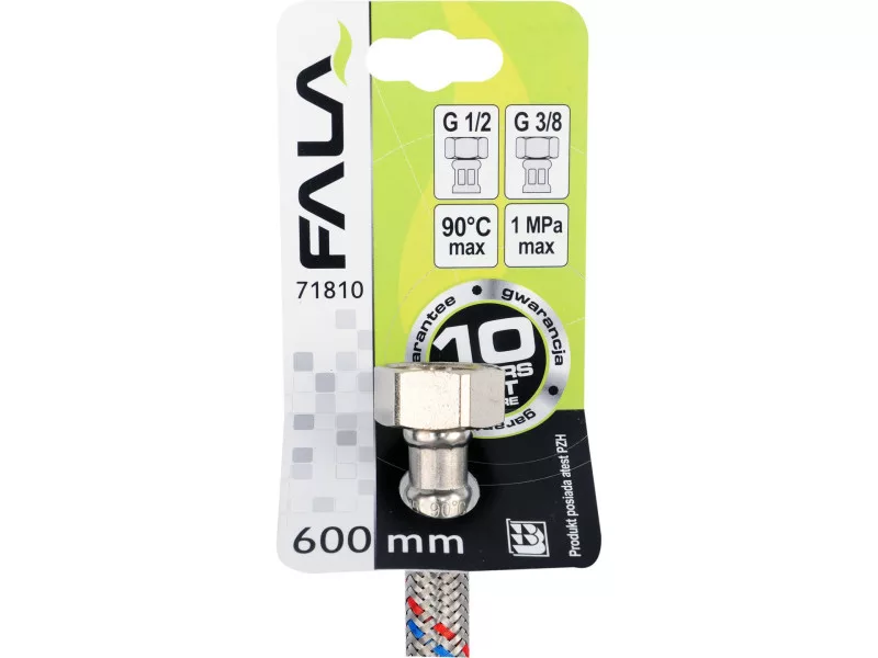 Flexibilná pripojovacia hadica s opletením z nehrdzavejúcej ocele. Vhodná na teplú a studenú vodu. Schválená Štátnym hygienickým ústavom na styk s pitnou vodou. Dĺžka 600 mm. Maximálny tlak 1 MPa. Maximálna teplota 90 C. Priemerný prietok 32 l/min. Vnútorný priemer 8 mm a vonkajší priemer 12 mm. Pripojovacie závity: vnútorný 1/2" x vnútorný 3/8". Gumová hadica EPDM, poniklované mosadzné prípojky, gumové tesnenie EPDM. Je určená na pripojenie WC splachovačov alebo ventilov.
