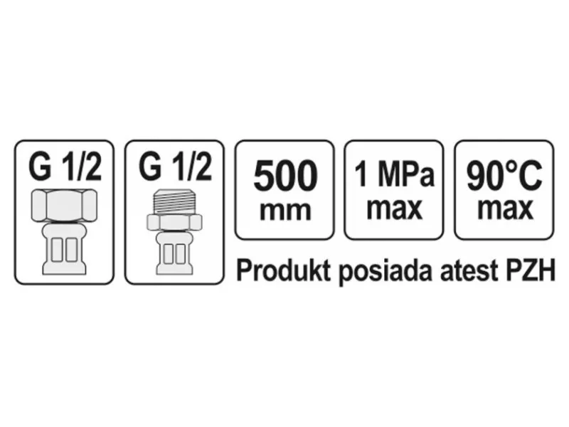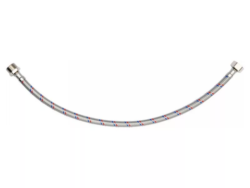 Flexibilná pripojovacia hadica s opletením z nehrdzavejúcej ocele. Vhodná na teplú a studenú vodu. Schválená Štátnym hygienickým ústavom na styk s pitnou vodou. Dĺžka 500 mm. Maximálny tlak 1 MPa. Maximálna teplota 90 C. Priemerný prietok 32 l/min. Vnútorný priemer 8 mm a vonkajší priemer 12 mm. Pripojovacie závity: vnútorný 1/2" x vonkajší 1/2". Gumová hadica EPDM, poniklované mosadzné prípojky, gumové tesnenie EPDM. Je určená na pripojenie WC splachovačov alebo ventilov.
