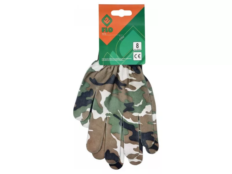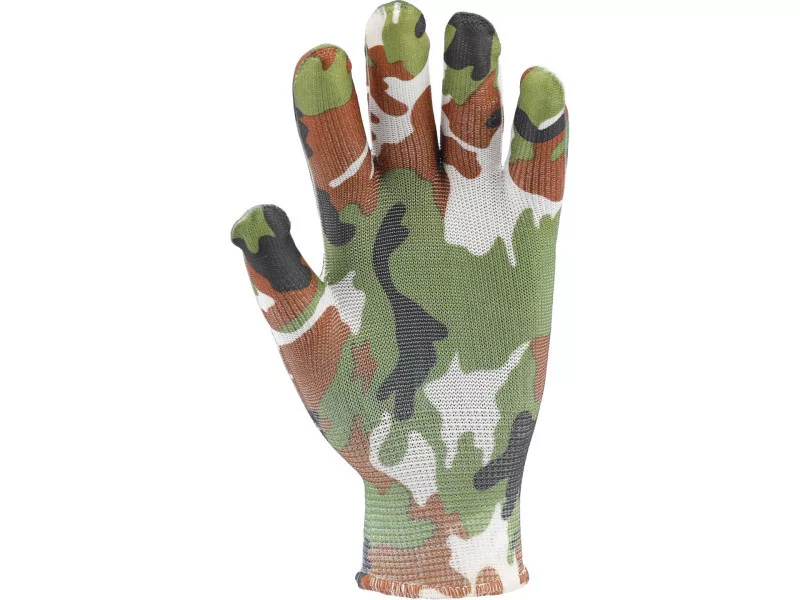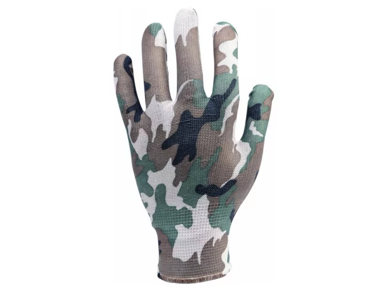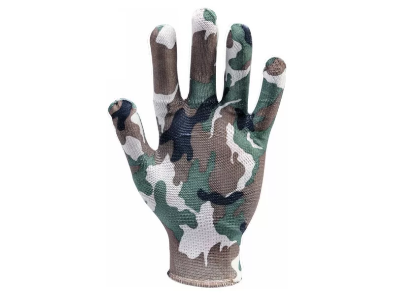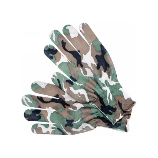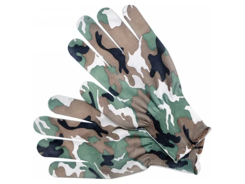 Ľahké záhradné rukavice z polyesteru s moro farbou. Bezšvová konštrukcia pre vysoký komfort a vynikajúci cit pre držaný predmet.