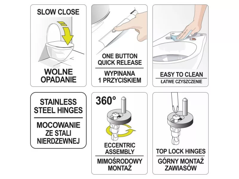 4. vďaka excentrickému nastaveniu upevnenia sa ľahko zmestí do väčšiny záchodových mís, kompaktných aj nástenných