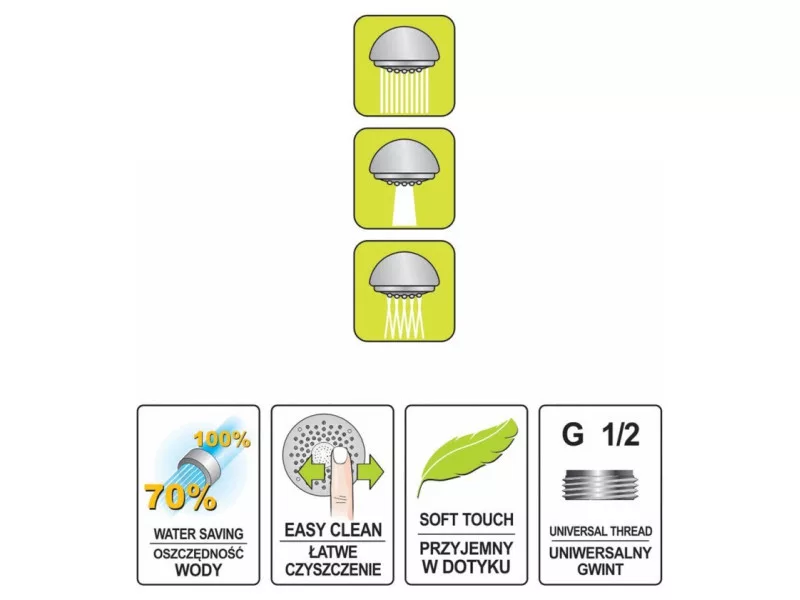 Vďaka silikónovým tryskám nebude odstraňovanie usadenín vodného kameňa problém. Priemer prípojky G1/2" je vhodný pre akúkoľvek tradičnú sprchovú hadicu.