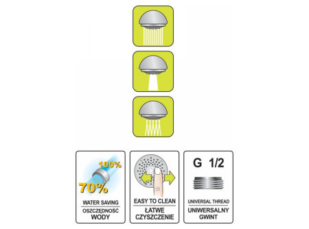 Sprchová hlavica KILE má moderný tvar, ktorý sa zhoduje s najnovšími módnymi trendmi. Je trvanlivá a pevne vyrobená. Disponuje regulátorom vody, ktorý znižuje spotrebu vody. Gumové kanály zabraňujú hromadeniu vodného kameňa.
