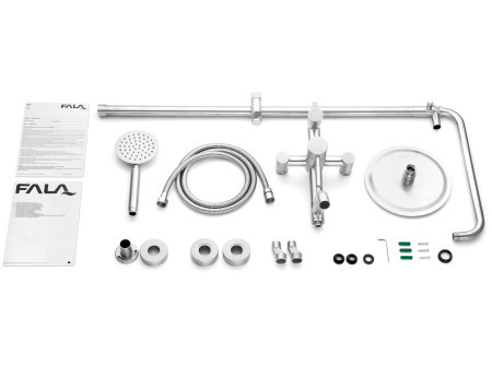 - sprchový box - batéria - dekoračné kryty s tesneniami - dažďová sprcha - sprchový stĺp - ručná sprcha - sprchová hadica s tesneniami - inštalačný manuál - záručný list