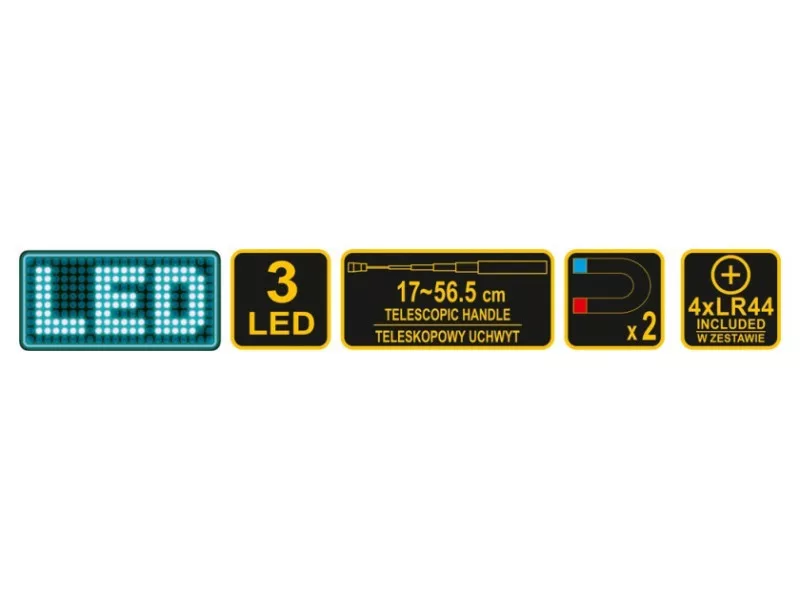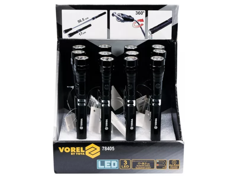 78405 je hliníkový teleskopický chápač s magnetom a funkciou baterky, ktorý je užitočný v dielni alebo garáži. Teleskopické rameno s maximálnou dĺžkou 56,5 cm je zakončené hlavou s magnetom na zdvíhanie kovových predmetov, ako sú skrutky, matice, podložky atď. z ťažko prístupných miest. Hlava je vybavená tromi LED diódami, ktoré osvetľujú pracovný priestor a uľahčujú nájdenie hľadaných predmetov. Hlava je namontovaná na flexibilnom 360-stupňovom otočnom krku a chápadlo má v základni aj ďalší magnet, ktorý umožňuje pripevnenie na kovové povrchy a osvetlenie pracovnej oblasti. Kompaktné rozmery v zloženom stave(17 cm) a kovový klip umožňujú ľahké prenášanie vo vrecku.
