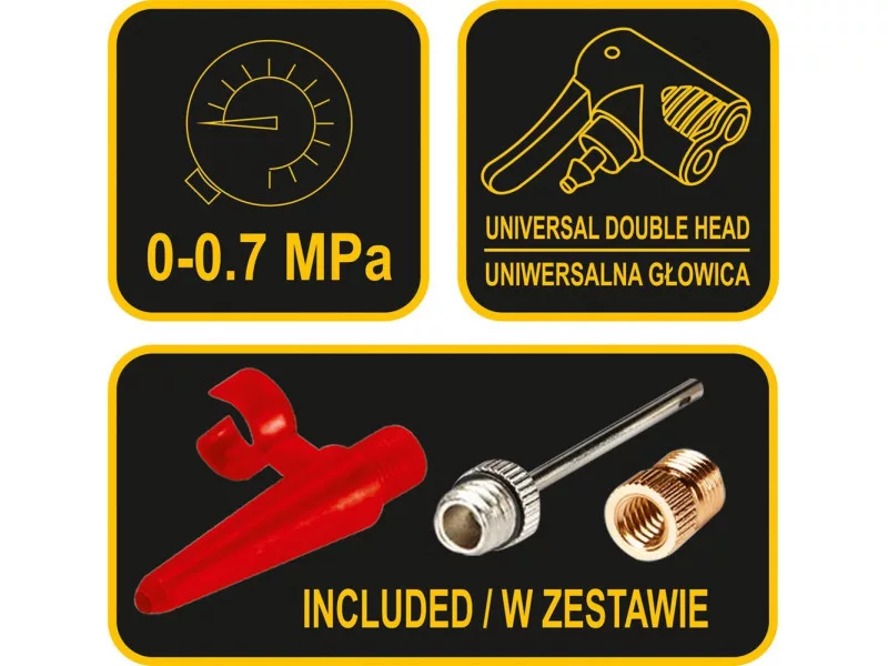 Jednopiestové nožné čerpadlo s manometrom. Vyrobená z kovu, ohybná hadička ukončená univerzálnou tryskou umožňujúcou čerpanie ventilov automobilov aj bicyklov. Tlakomer odstupňovaný po 7 BAR. Súčasťou sú aj univerzálne koncovky na čerpanie lôpt, matracov atď.