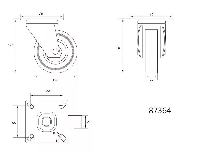 Otočné koleso s priemerom 125 mm, s ložiskami, behúň zo sivej gumy. Otočné koleso s priemerom 125 mm, s ložiskami, behúň zo sivej gumy.
