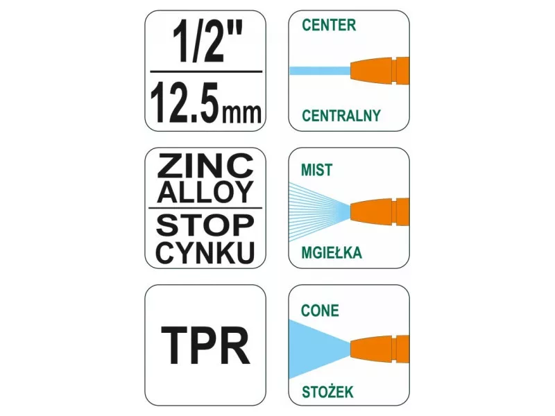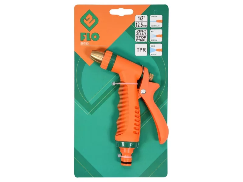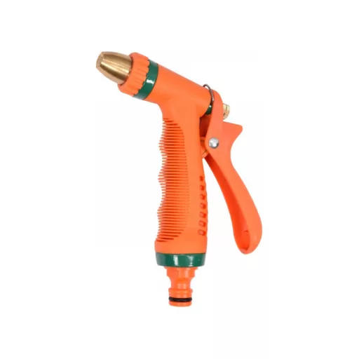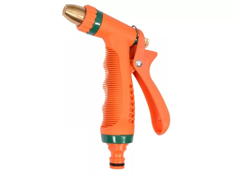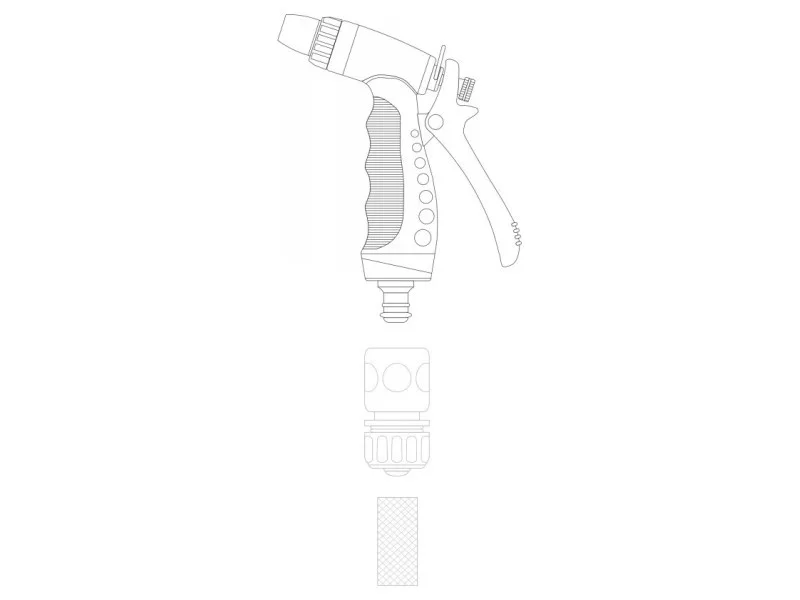 Striekacia pištoľ s reguláciou prietoku a možnosťou výberu z troch prúdov: stredový, kužeľový, hmlový.