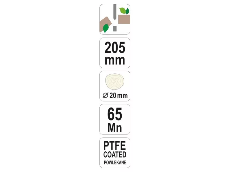 Čepeľ vyrobená z ocele 65 Mn, potiahnutá teflónom. Dĺžka nástroja 205 mm.